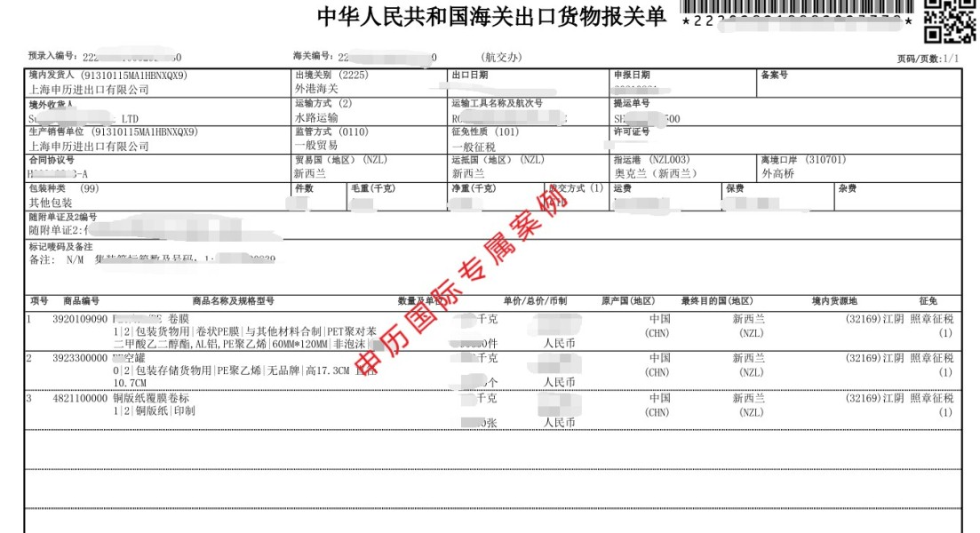 出口货物标的:PE材料(PE罐、PE膜)、铜版纸标签等等